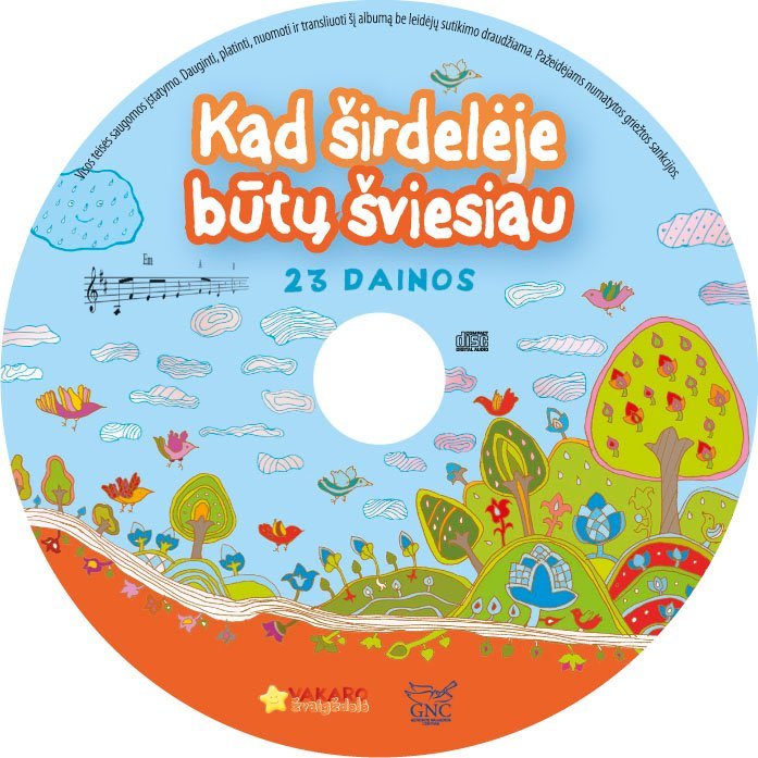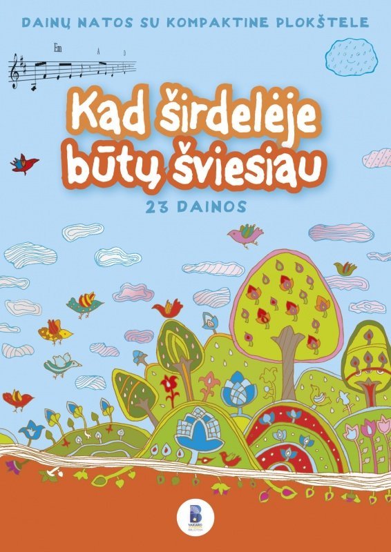 „Kad širdelėje būtų šviesiau“ Knyga su kompaktine plokštele skirta ikimokyklinio meninio ugdymo (muzikos) pedagogams, jaunesniojo ir vyresniojo mokyklinio amžiaus vaikams, tėvams ir visiems, mėgstantiems muziką. Leidinį sudaro dainos, skambėjusios žurnalo „Vakaro žvaigždelė“ kompaktinėse plokštelėse. Knygoje rasite dainų, skirtų šv. Kalėdų ir šv. Velykų laikotarpiui, lopšinių ir kitų autorinių dainų. Melodijos ir žodžių darna bei nuoširdus atlikimas – tai derinys, kuris lyg nematomo dailininko teptukas nuspalvina jūsų kasdienybę šviesiomis spalvomis. Net jeigu nemokate groti iš natų, tiesiog klausykitės šių dainų – jos nuramins, pakylės, o galbūt pažadins, atskleis jūsų talentą. Skatiname jus taip pat kurti ir drąsiau dalintis savo kūryba – kad širdelėje taptų šviesiau. Šiuo metu knygeles galima įsigyti: Vilniuje: „Vakaro žvaigždelės“ redakcijoje (Pylimo 20-10, tel. 8 620 20221) Katalikų pasaulio leidiniai knygynuose (Pranciškonų g. 3/6, (8 5) 262 0572); Šventaragio g. 4, tel.: (8 5) 212 4057, 8 612 08 437) Kaune: Šv. Kazimiero knygynas (Vilniaus g. 3, tel. (8 37) 20 67 95) Leidėjas- Gerosios Naujienos centras Išleidimo metai – 2015 Puslapių skaičius – 36 Formatas – 21 x 29,5 cm Viršelis – Minkštas Svoris – 170 g.