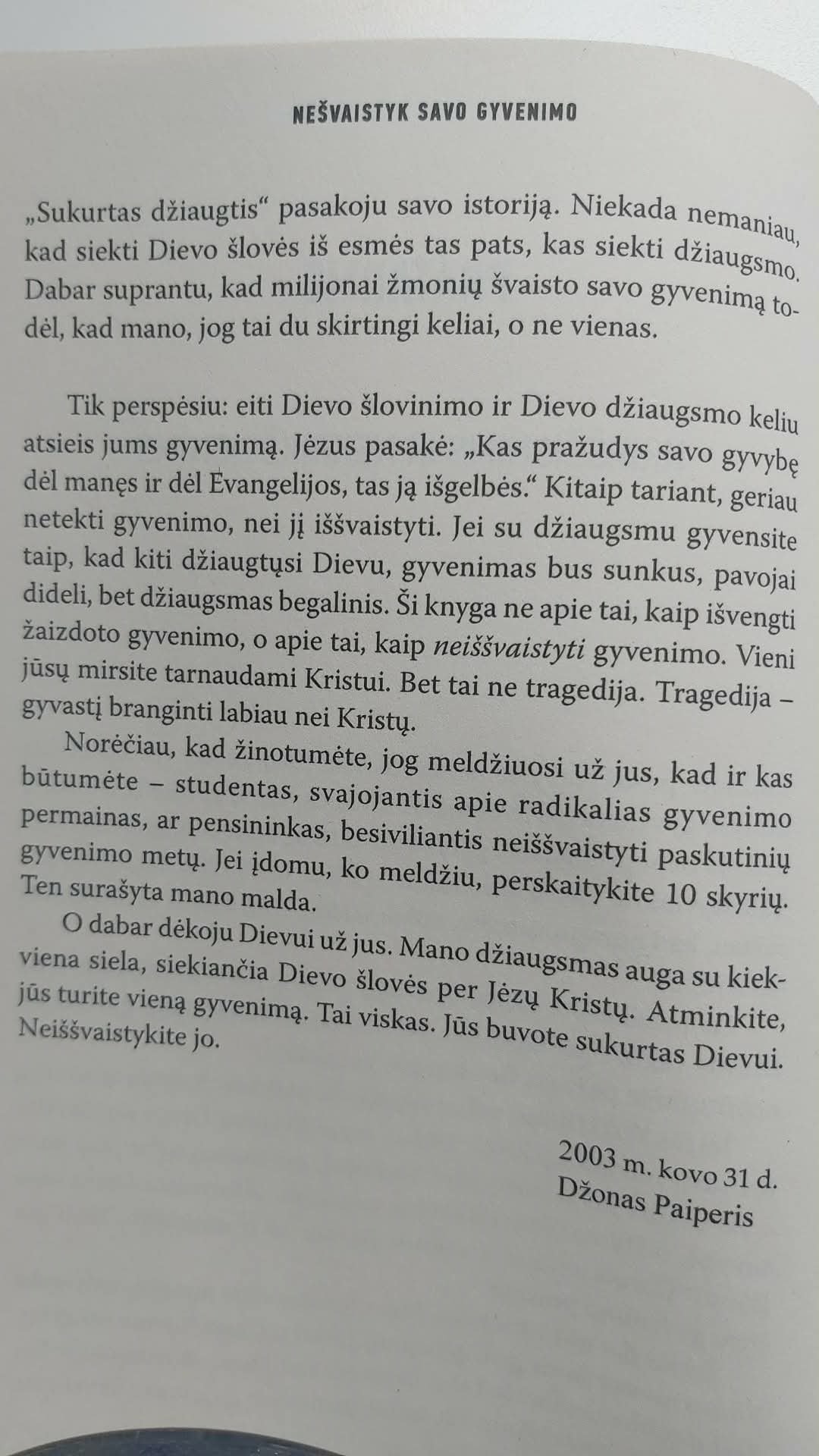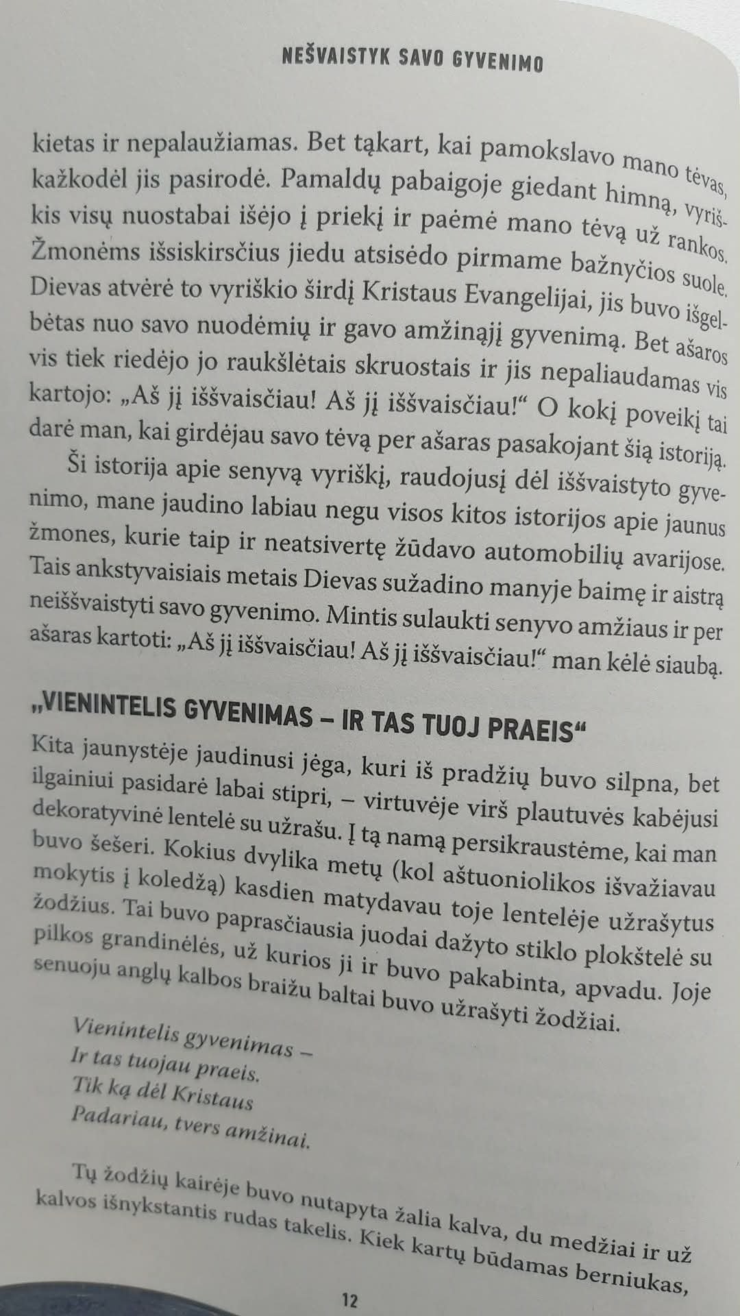 Dauguma leidžia gyvenimą be aistros Dievui eikvodami jį banalioms pramogoms, gyvendami savo malonumui ir patogumui, gal net stengdamiesi išvengti nuodėmės. Ši knyga įspės jus nepasinerti į bevertį gyvenimą. Ji paskatins gyventi ir mirti giriantis Kristaus kryžiumi, o Dievo šlovę paversti vienintele savo aistra. Jei tikite, kad gyvenimas – tai Kristus, o mirtis – tik laimėjimas, perskaitykite šią knygą, mokykitės gyventi dėl Kristaus ir nešvaistykite savo gyvenimo!