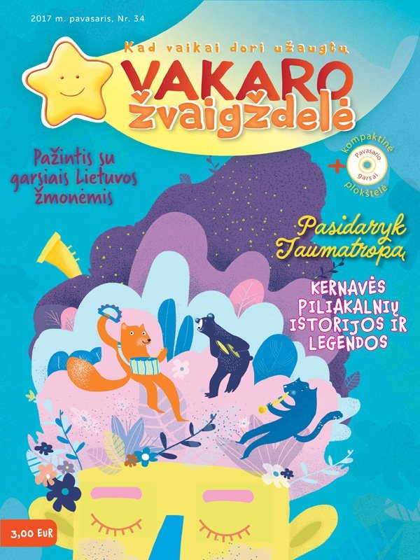 „Vakaro žvaigždelė“ (2017 m., pavasaris, Nr. 34) Pavasario numeris nekantrauja būti perskaitytas! Šiame numeryje rasite daug įdomybių. Žinių lagaminas – Geriausi draugai Vytis ir Kotryna pristatys garsiausius Lietuvos žmones: sportininkus, menininkus bei mokslininkus, kurie mūsų šalies vardą garsina visame pasaulyje. Kas jie tokie? Sužinosite „Žinių lagamino“ rubrikoje. Lietuvos kompozitorių muzikiniai portretai – Jeigu kažkiek domitės muzikos pasauliu, privalote susipažinti su Lietuvių kompozitoriais! Ar žinote, koks pirmasis lietuvių pianistas tapo tarptautinio konkurso laureatu? Koks kompozitorius domėjosi vabzdžiais ir parašė muzikines pjeses apie juos? Kviečiame susipažinti su kompozitoriumi Stasiu Vainiūnu rubrikoje „Lietuvos kompozitorių muzikiniai portretai”. Sraigių pamokėlės – Dvi geros draugės – sraigė Naigė ir sraigutė Gutė vartydamos senas knygas, atranda daug įdomių senovinių žodžių ir kalbasi apie tai, kaip keitėsi mūsų kalba. 2017 – piliakalnių metai… Ar žinai iš kur atsirado Kernavės piliakalniai? Kada ant jų apsigyveno žmonės? O gal tau įdomu kaip jie vadinasi? Ar žinai kokia svarbi buvo Kernavė senovėje ir tai kad legendos byloja apie senovinius tunelius nusidriekusius iki Vilniaus? Visa tai sužinosi perskaitęs straipsnelį. Straipsnyje „Kodėl ne dešimt?..“ aptariama vaikų mokymosi tema: kaip jaučiasi vaikai, susidūrę su dideliais tėvų lūkesčiais jų mokslo pasiekimų atžvilgiu bei ką svarbu daryti tėvams, kad vaikai mokydamiesi jaustų tėvų palaikymą ir supratimą. Tai pat skaitykite Velykų istoriją, džiaukitės pasaką, atlikite užduotėles, išmokite pasigaminti Taumatropą ir be galo sveikus ir gardžius pupelių virtinukus. Kompaktinėje plokštelė „Pavasario garsai“ 1. Giesmė „Tu pakvieski“ 2. Daina „Katinas Markizas“ 3. Daina „Verslininkė“ 4. „Lopšinytė“ 5. Pasaka „Vėjas ir sagutė” 6. Pasaka „Raudonkepuraitė” 7. Radijo paveikslėlis „Geras darbas visada šalia” 8. Vabzdžių siuita „Žiogas“ 9. Vabzdžių siuita „Drugelis“ 10. Giesmelės „Tu pakvieski“ garso takelis 11. Dainos „Katinas Markizas“ garso takelis Giesmė „Tu pakvieski“ skleidžia ramybę ir šviesą. Daina „Katinas Markizas“ skirta atlikti mažiausiems rodant gestus. Daina „Verslininkė“ skirta klausytis visai šeimai – kad tėvai pasiklausę dainos, susimąstytų ir skirtų daugiau laiko vaikams. Pasaką „Vėjas ir sagutė“ sukūrė neregė vaikų rašytoja Indrė Gaskaitė. Ši pasaka – tai Indrės dovana „Vakaro žvaigždelės“ klausytojams. Prancūzų rašytojo Šarlio Pero pasakos „Raudonkepuraitė“ pabaigoje skamba sueiliuotas tekstas, skirtas mergaitėms, kad jos netikėtų vaikinų gražbyliavimu. O radijo paveikslėlis „Geras darbas visada šalia“ skatina vaikus padėti savo tėvams. Klausydamiesi Stasio Vainiūno vabzdžių siuitų „Žiogas“ ir „Drugelis“, nuspalvinkite ornamentus žurnale. Matysite, kaip skirtingi muzikos garsai kviečia naudoti skirtingas spalvas. Visi gimstame turėdami muzikinę klausą, tik nelavinama ji dingsta, todėl naudinga muzikuoti visiems – ir tėveliams, ir vaikučiams, tai bus puikus laikas su šeima klausant dainelių, giesmelių bei muzikinių pasakų. Kviečiame prenumeruoti žurnalą „Vakaro žvaigždelė“. Taip sutaupysite, o po prenumeratos apmokėjimo pirmą žurnalą gausite teisiai į pašto dėžutę jau rugsėjo, gruodžio, kovo ar birželio mėnesį – priklausomai nuo to, kuris mėnuo nuo užsakymo bus artimiausias.
