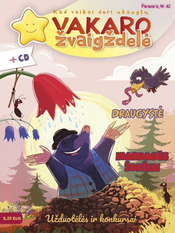 Su pavasariniu vėjeliu žurnaliukas skuba pas visus! Atėjęs pavasaris jau budina gamtą, saulė vis dažniau lepina šiluma ir žarsto daugybę laimės spindulių, nuotaika gerėja, šypsenos platėja, – ir mes skubame pasidalinti džiugia naujiena: jau išleistas pavasario žurnalo ,,Vakaro žvaigždelė“ numeris. Šio numerio pagrindinė tema: Draugystė. „Vaikystės sodo“ rubrikoje rašoma apie draugystę ikimokykliniame amžiuje. Rubrikoje „Pasaka“ skaitykite apie pelėdžiukę Ūkę Pūkę (ištrauka iš Zanes Zustos knygos „Ūkė Pūkė grįžta namo”, leidykla debesuganyklos.lt). Straipsnyje „Kurmiukas pavasario rytą” pagrindinis veikėjas – linksmasis kurmiukas pabunda iš žiemos miego ir budina visus miško gyventojus. Naujoje rubrikoje „Draugystės skrynelė” išmoksite mandagių žodžių, kuriuos kasdien reikia tarti ne tik draugams, bet ir kitiems žmonėms. Rubrikoje „Aš tarp draugų” susipažinsite su Šiaurės Airijoje gyvenančiais tautiečiais ir sužinosite, ką jiems reiškia draugystė. Rubrikoje „Nudžiugink draugą” gaminsite draugystės žemėlapį iš akmenukų. Rubrikoje „Bendraujame skanaudami” jūsų laukia sveikuoliškų sumuštinių receptas. Rubrikoje „Tėveliams” skaitysite straipsnį „Kas mano geriausia draugė?.. Arba Draugystė veža“. Jūsų laukia dviejų dainelių natos, smagios užduotėlės, žaidimas su kauliukais, bei konkursai. Žurnalo priedas – kompaktinė plokštelė „Geriausias draugas“, kurioje skamba linksmos dainelės ir įdomios, prasmingos pasakos. Taip pat galite atsisiųsti kompaktinės plokštelės (Nr. 42) turinį tiesiai į savo kompiuterį ar telefoną. Slaptažodis žurnale. Linkime malonaus skaitymo ir klausymo! Kviečiame prenumeruoti žurnalą „Vakaro žvaigždelė“. Taip sutaupysite, o po prenumeratos apmokėjimo pirmą žurnalą gausite teisiai į pašto dėžutę jau rugsėjo, gruodžio, kovo ar birželio mėnesį – priklausomai nuo to, kuris mėnuo nuo užsakymo bus artimiausias.