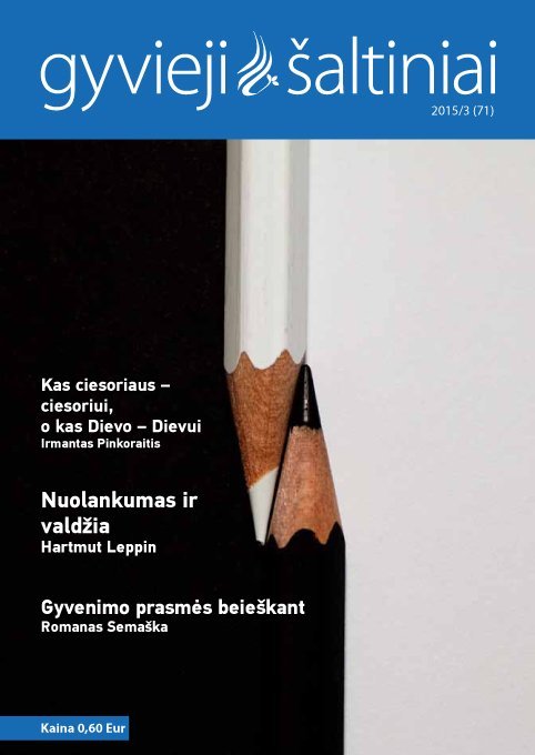 Rudens „Gyvieji šaltiniai“ – ant jūsų stalo! Išleistas naujas žurnalo „Gyvieji šaltiniai“ rudens numeris. Jo tema – „Krikščionys ir valdžia“. Šiais laikais, kai krikščionys visame pasaulyje tampa vis labiau persekiojamais asmenimis, tema apie krikščionių santykį su valdžios struktūromis įgauna visiškai kitokią prasmę. Šiame numeryje siūlome jums prasmingus ir aktualius skaitinius įvairiomis krikščionybės santykio su valdžia temomis. Straipsnyje „Kas ciesoriaus – ciesoriui, o kas Dievo – Dievui“ autorius Irmantas Pinkoraitis aptaria, kaip krikščionys turėtų elgtis su mokesčiais, kad išliktų sąžiningi prieš valdžią ir nenusidėtų Dievui. „Istorijos puslapių“ rubrikoje skaitytojas ras straipsnį „Nuolankumas ir valdžia: vėlyvosios Romos imperatoriai krikščionys“. Jame atskleidžiama, kokiu būdu senovėje valdantieji Romos imperatoriai suderindavo tiek absoliutinės valdžios, tiek kuklumo ir nuolankumo bruožus. Straipsnyje „Penkios priežastys, kodėl jauni krikščionys ir pastoriai vengia politikos“ rasite atsakymus, kodėl Dievui pašaukus krikščionį eiti į politiką, ši sritis turi tapti krikščionio aistra. „Misijų kelionė per pasaulį“ – straipsnis apie misiją „WorldRace“, kurios dalyviai pasakoja apie nepaprastas patirtis su Dievu,jiems paskelbiant Evangeliją. „Liudijimo“ rubrikoje pristatome straipsnį „Karo tarnyboje visada liksiu su Viešpačiu“. Tai jauno žmogaus, pasirinkusio savanorišką karo tarnybą, siekis su Dievo pagalba įveikti patyčių ir menkavertiškumo baimes. „Gyvųjų šaltinių“ rudens numeryje taip pat rasite dvasingos poezijos, informaciją, kaip pačiam pasidaryti evangelijos lankstinuką, laisvalaikio skaitinių apie politiką ir kitos prasmingos informacijos. Linkime malonaus skaitymo! Kviečiame prenumeruoti žurnalą „Gyvieji šaltiniai“ ir gauti jį tiesiai į namus.